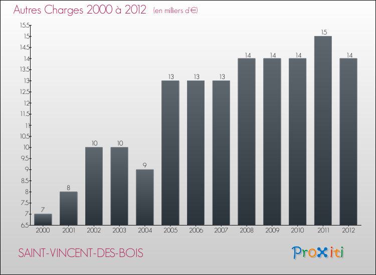En 2012, les charges de fonctionnement de la commune de Saint-Vincent-des-Bois étaient de : 122 000 € décomposées comme suit :