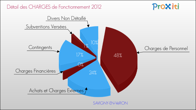 En 2012, les charges de fonctionnement de la commune de Savigny-en-Véron étaient de : 850 000 € décomposées comme suit :