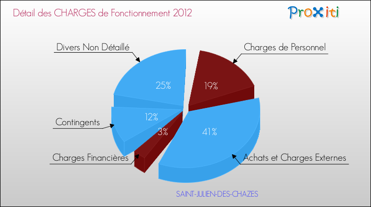 En 2012, les charges de fonctionnement de la commune de Saint-Julien-des-Chazes étaient de : 59 000 € décomposées comme suit :