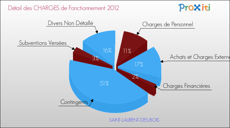 En 2012, les charges de fonctionnement de la commune de Saint-Laurent-des-Bois étaient de : 122 000 € décomposées comme suit :