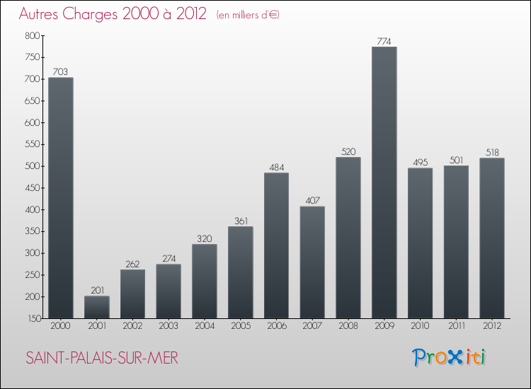 En 2012, les charges de fonctionnement de la commune de Saint-Palais-sur-Mer étaient de : 5 879 000 € décomposées comme suit :