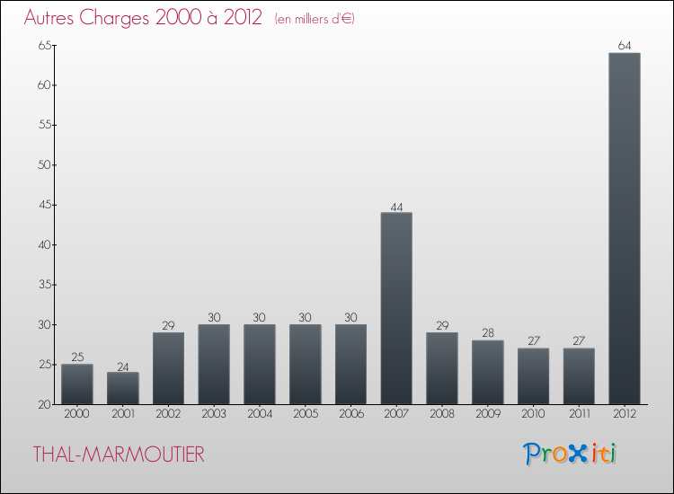 En 2012, les charges de fonctionnement de la commune de Thal-Marmoutier étaient de : 365 000 € décomposées comme suit :