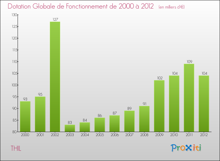 En 2012, le budget de fonctionnement de la commune de Thil se montait à : 663 000 € décomposé comme suit :