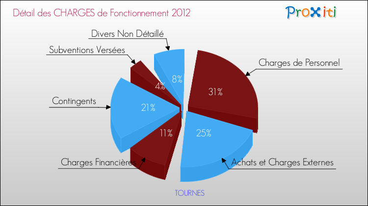 En 2012, les charges de fonctionnement de la commune de Tournes étaient de : 880 000 € décomposées comme suit :