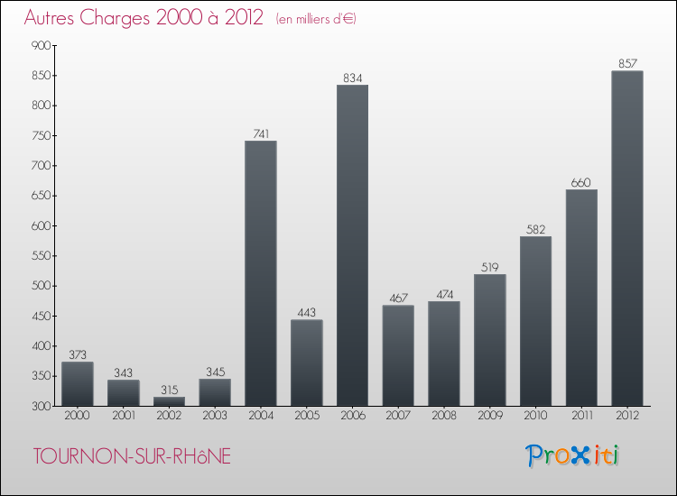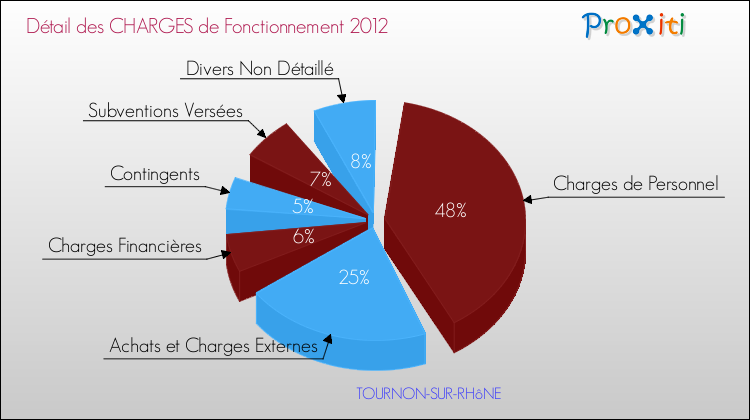 En 2012, les charges de fonctionnement de la commune de Tournon-sur-Rhône étaient de : 10 103 000 € décomposées comme suit :