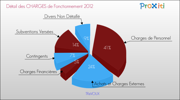 En 2012, le budget de fonctionnement de la commune de Trévoux se montait à : 6 619 000 € décomposé comme suit :