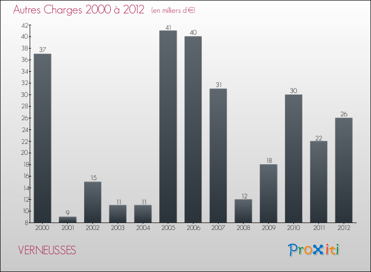 En 2012, les charges de fonctionnement de la commune de Verneusses étaient de : 96 000 € décomposées comme suit :