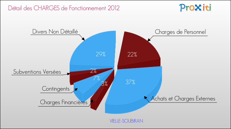 En 2012, les charges de fonctionnement de la commune de Vielle-Soubiran étaient de : 344 000 € décomposées comme suit :