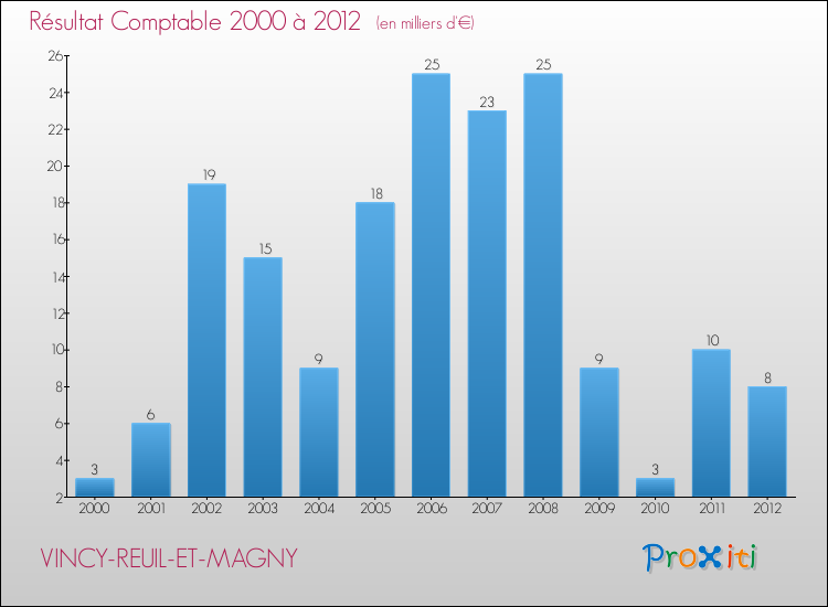 Le résultat comptable de la commune de Vincy-Reuil-et-Magny s'établissait ainsi à : + 8 000 € fin 2012.