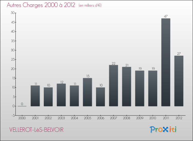 En 2012, les charges de fonctionnement de la commune de Vellerot-lès-Belvoir étaient de : 108 000 € décomposées comme suit :