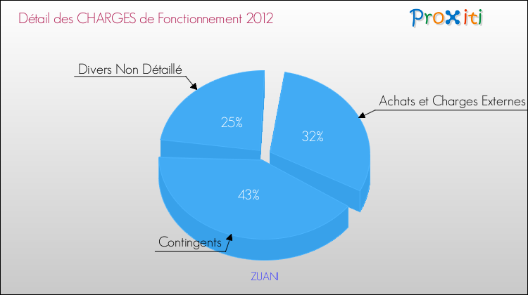 En 2012, les charges de fonctionnement de la commune de Zuani étaient de : 53 000 € décomposées comme suit :