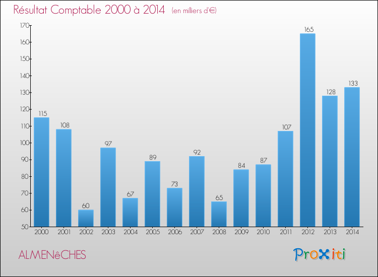 Le résultat comptable de la commune de Almenêches s'établissait ainsi à : + 133 000 € fin 2014.