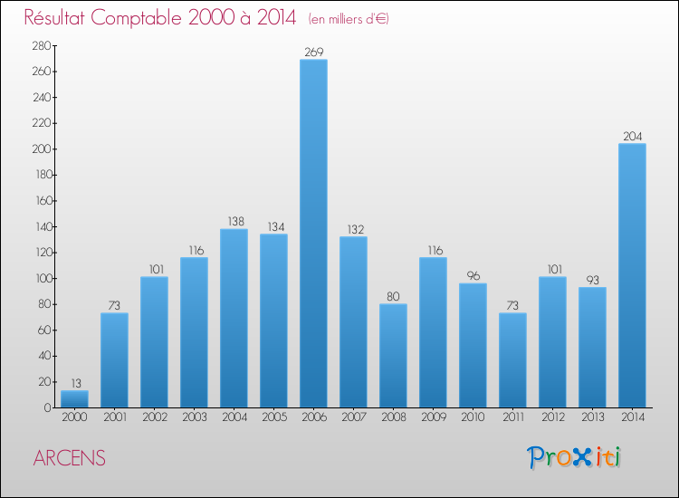 Le résultat comptable de la commune de Arcens s'établissait ainsi à : + 204 000 € fin 2014.