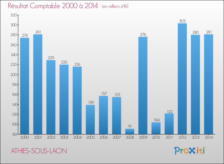 Le résultat comptable de la commune de Athies-sous-Laon s'établissait ainsi à : + 281 000 € fin 2014.