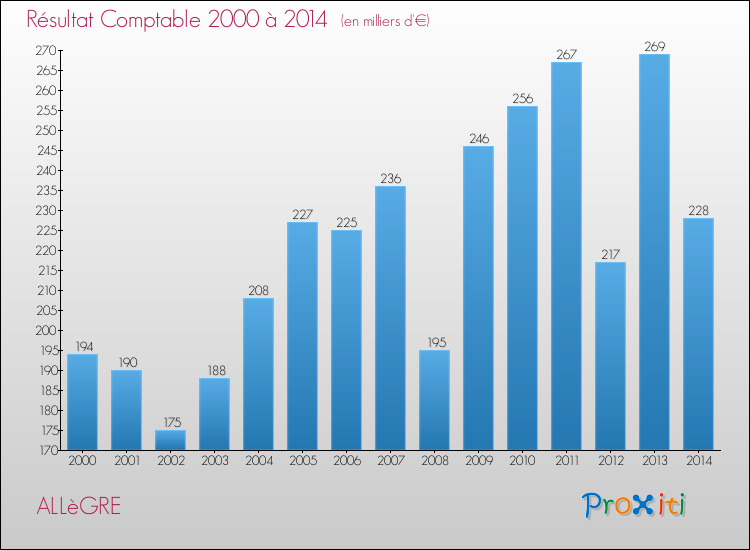 Le résultat comptable de la commune de Allègre s'établissait ainsi à : + 228 000 € fin 2014.