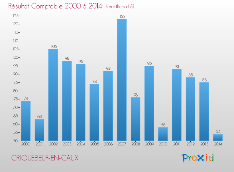 Le résultat comptable de la commune de Criquebeuf-en-Caux s'établissait ainsi à : + 54 000 € fin 2014.