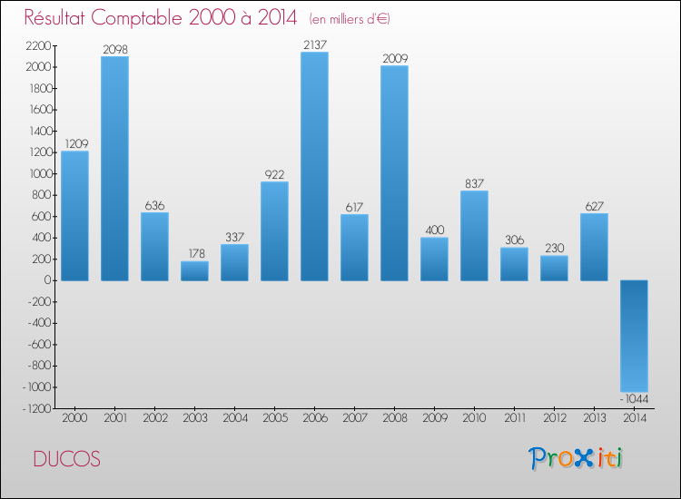 Le résultat comptable de la commune de Ducos s'établissait ainsi à : -1 044 000 € fin 2014 (recettes-dépenses).