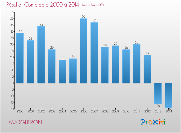 Le résultat comptable de la commune de Margueron s'établissait ainsi à : -19 000 € fin 2014 (recettes-dépenses).