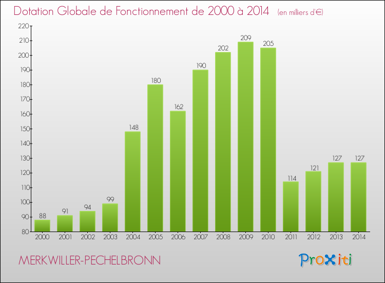 En 2014, à Merkwiller-Pechelbronn, ce budget est en baisse de 3.88 % par rapport à 2013.