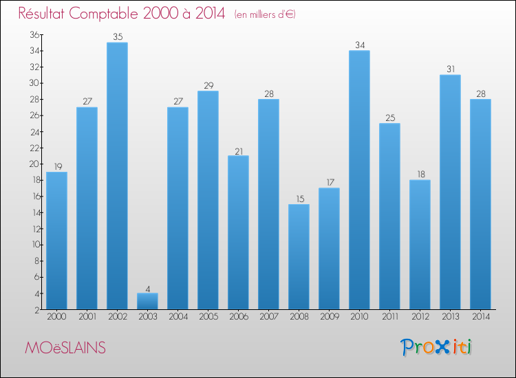 Le résultat comptable de la commune de Moëslains s'établissait ainsi à : + 28 000 € fin 2014.