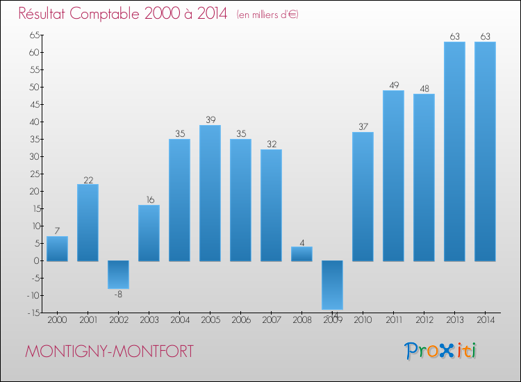 Le résultat comptable de la commune de Montigny-Montfort s'établissait ainsi à : + 63 000 € fin 2014.