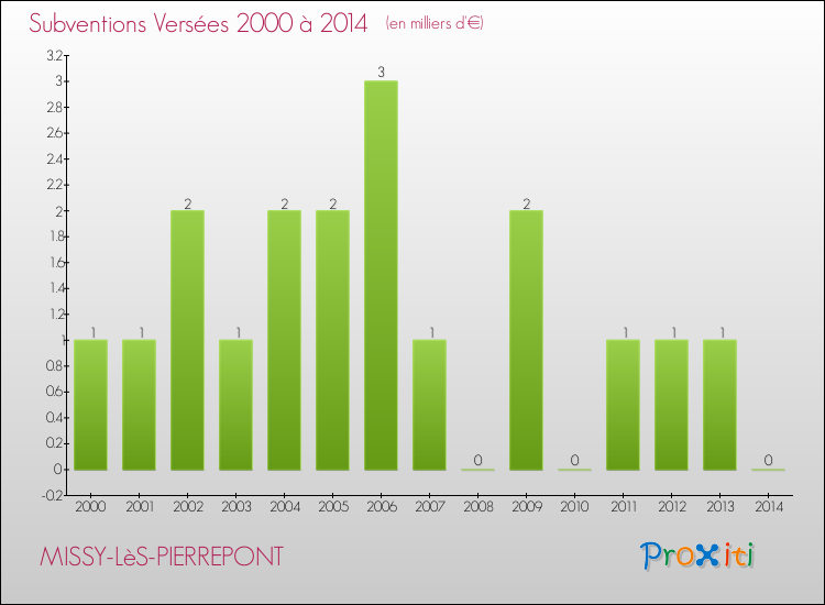 En 2014, à Missy-lès-Pierrepont, ce budget est en baisse de 61.39 % par rapport à 2013.