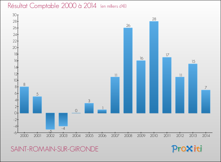 Le résultat comptable de la commune de Saint-Romain-sur-Gironde s'établissait ainsi à : + 7 000 € fin 2014.