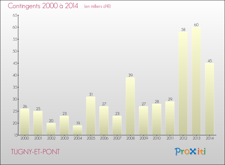 En 2014, à Tugny-et-Pont, ce budget est en augmentation de 1.54 % par rapport à 2013.