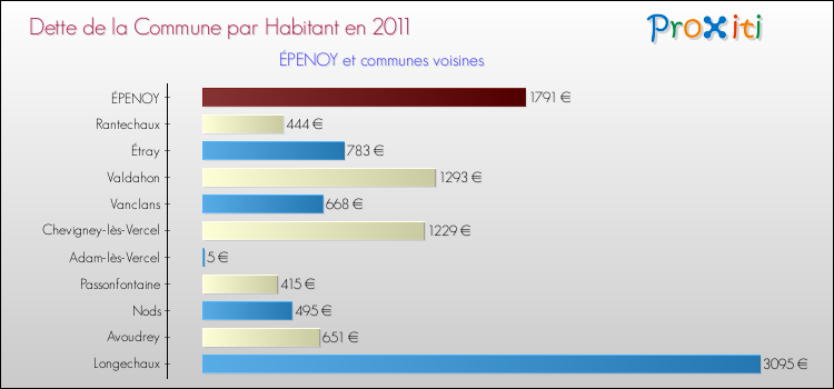 A noter : la valeur moyenne de la dette par habitant des communes françaises similaires à Épenoy était de 644 € par habitant, en 2011.