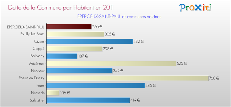 A Épercieux-Saint-Paul, la dette due par habitant de la commune en 2011 est donc moins élevée de 61.18 % que pour des communes similaires.