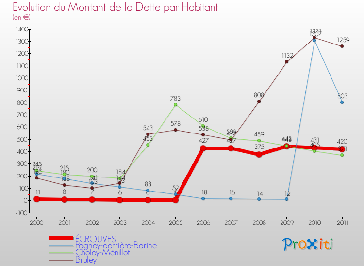 A Écrouves, la dette par habitant a donc augmenté de 3718.18 % entre 2000 et 2011.