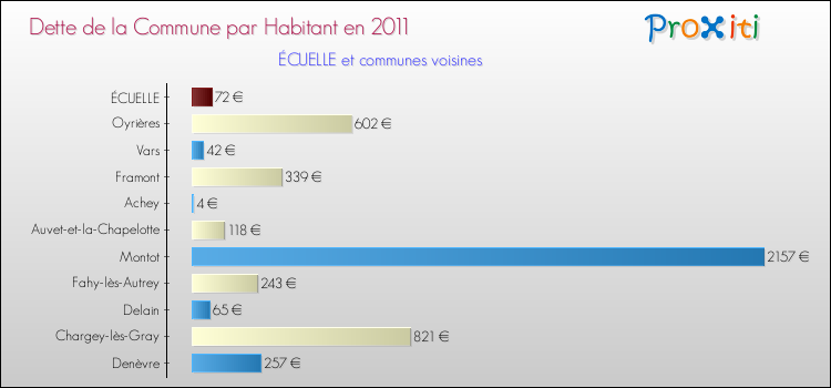 A Écuelle, la dette due par habitant de la commune en 2011 est donc moins élevée de 85.74 % que pour des communes similaires.
