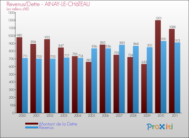 Comparaison Revenus/Dette de Ainay-le-Château (de 2000 à 2011)