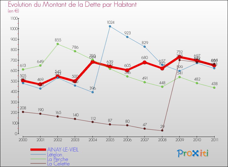 Pendant la même période, les communes françaises similaires à Ainay-le-Vieil, ont vu leur dette par habitant augmenter de 24.08 % en moyenne entre 2000 et 2011.