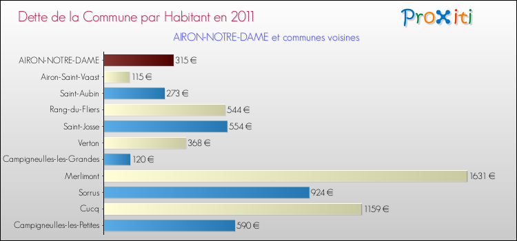 A Airon-Notre-Dame, la dette due par habitant de la commune en 2011 est donc moins élevée de 37.38 % que pour des communes similaires.