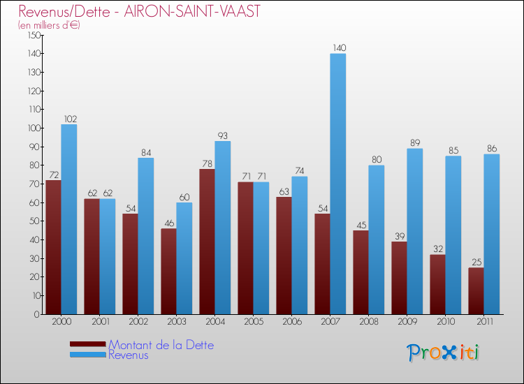 Comparaison Revenus/Dette de Airon-Saint-Vaast (de 2000 à 2011)