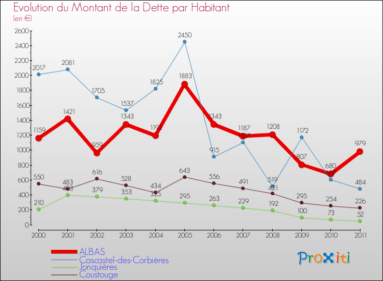 Pendant la même période, les communes françaises similaires à Albas, ont vu leur dette par habitant augmenter de 43.47 % en moyenne entre 2000 et 2011.