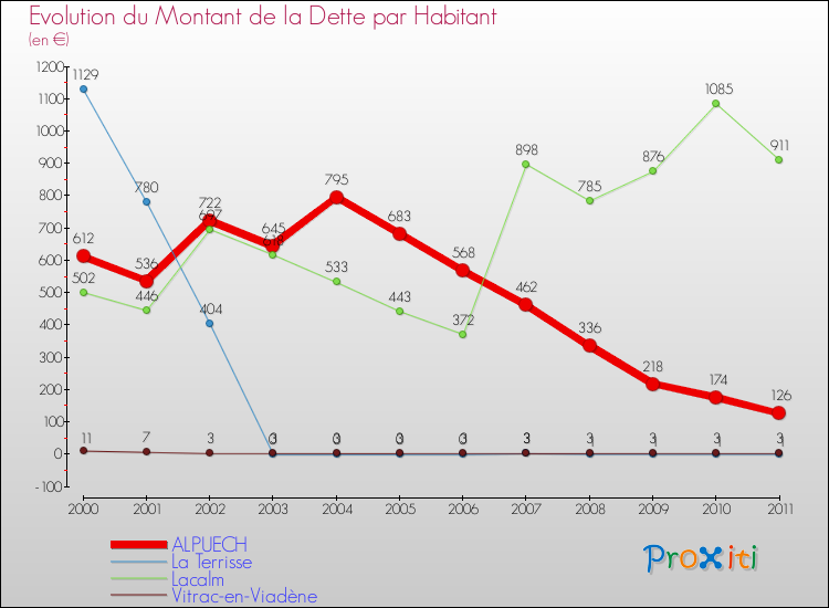 A Alpuech, la dette par habitant a donc baissé de 79.41 % entre 2000 et 2011.