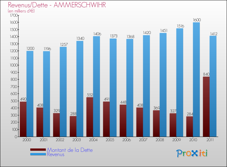 Comparaison Revenus/Dette de Ammerschwihr (de 2000 à 2011)