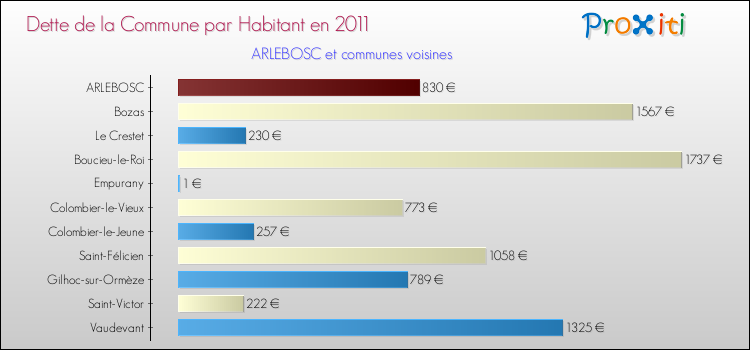 A noter : la valeur moyenne de la dette par habitant des communes françaises similaires à Arlebosc était de 493 € par habitant, en 2011.