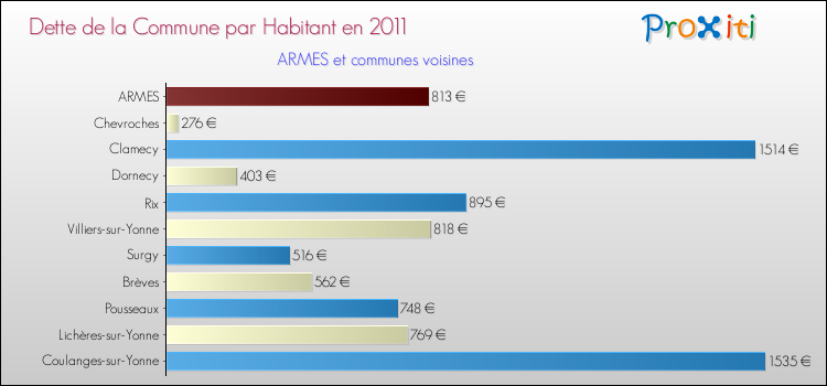 A Armes, la dette due par habitant de la commune en 2011 est donc plus élevée de 55.45 % que pour des communes similaires.