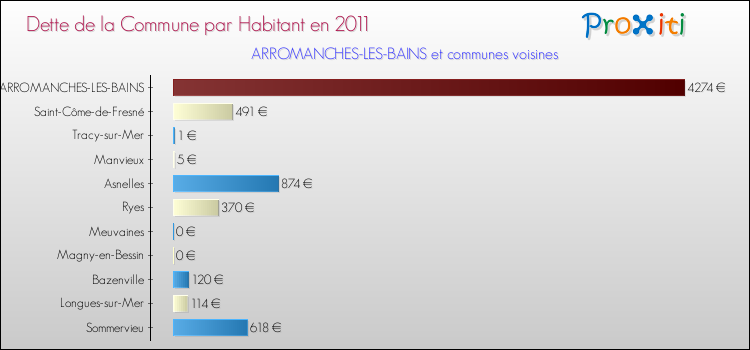A Arromanches-les-Bains, la dette due par habitant de la commune en 2011 est donc plus élevée de 563.66 % que pour des communes similaires.