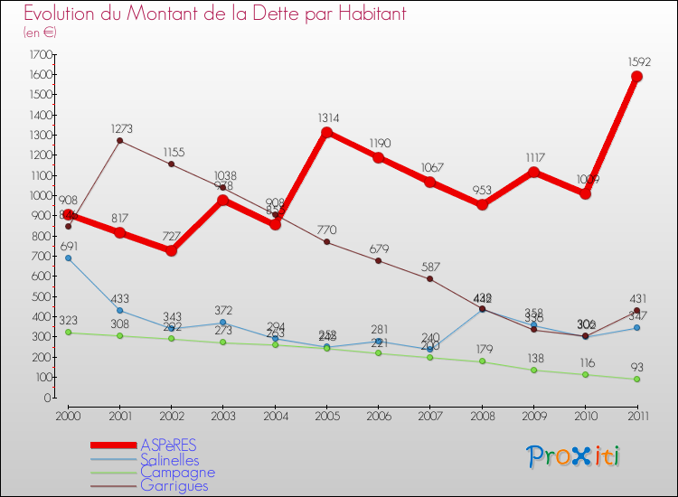 A Aspères, ce montant de la dette est en augmentation de 62.31 % par rapport à 2010.