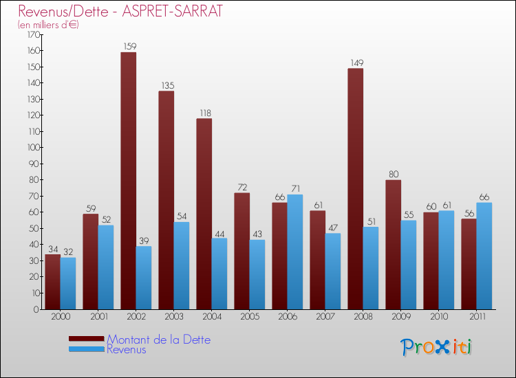 Comparaison Revenus/Dette de Aspret-Sarrat (de 2000 à 2011)