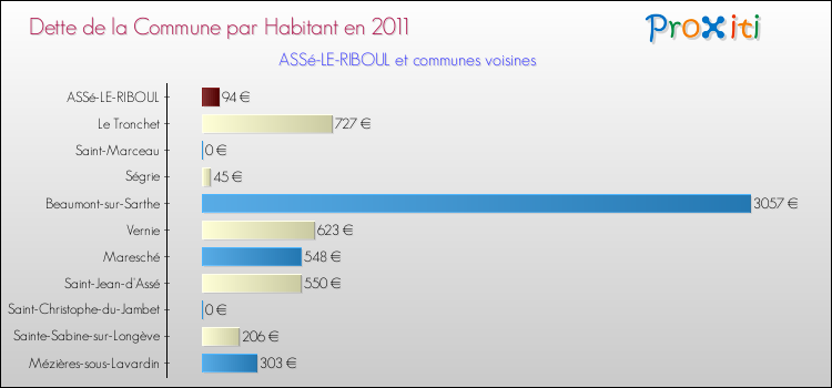 A noter : la valeur moyenne de la dette par habitant des communes françaises similaires à Assé-le-Riboul était de 523 € par habitant, en 2011.