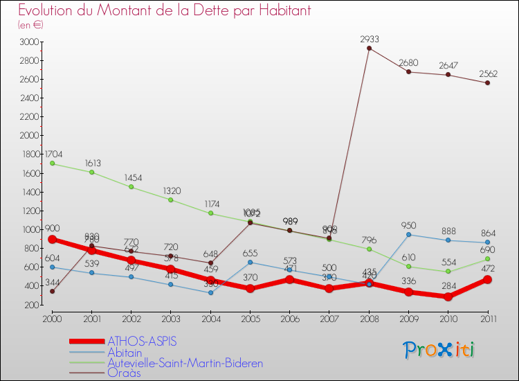 A Athos-Aspis, ce montant de la dette est en augmentation de 68.52 % par rapport à 2010.