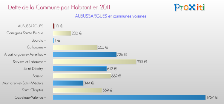 A noter : la valeur moyenne de la dette par habitant des communes françaises similaires à Aubussargues était de 426 € par habitant, en 2011.