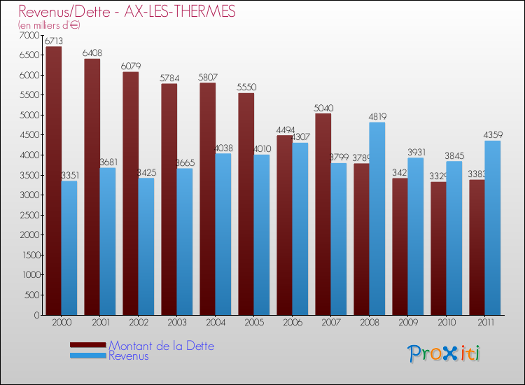 Comparaison Revenus/Dette de Ax-les-Thermes (de 2000 à 2011)