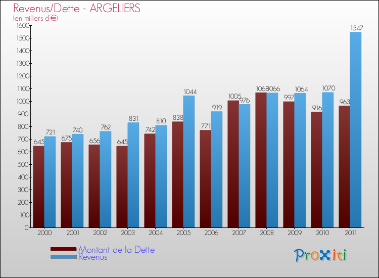 Comparaison Revenus/Dette de Argeliers (de 2000 à 2011)