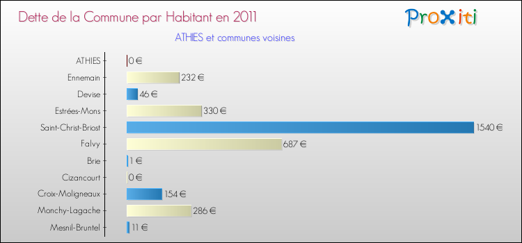 A noter : la valeur moyenne de la dette par habitant des communes françaises similaires à Athies était de 644 € par habitant, en 2011.